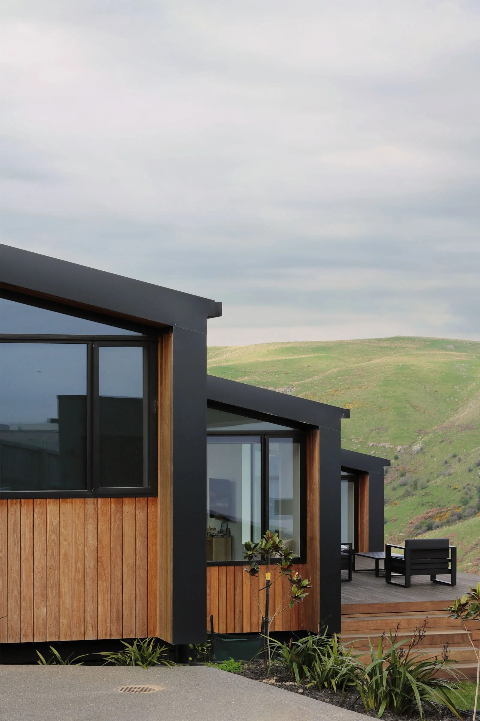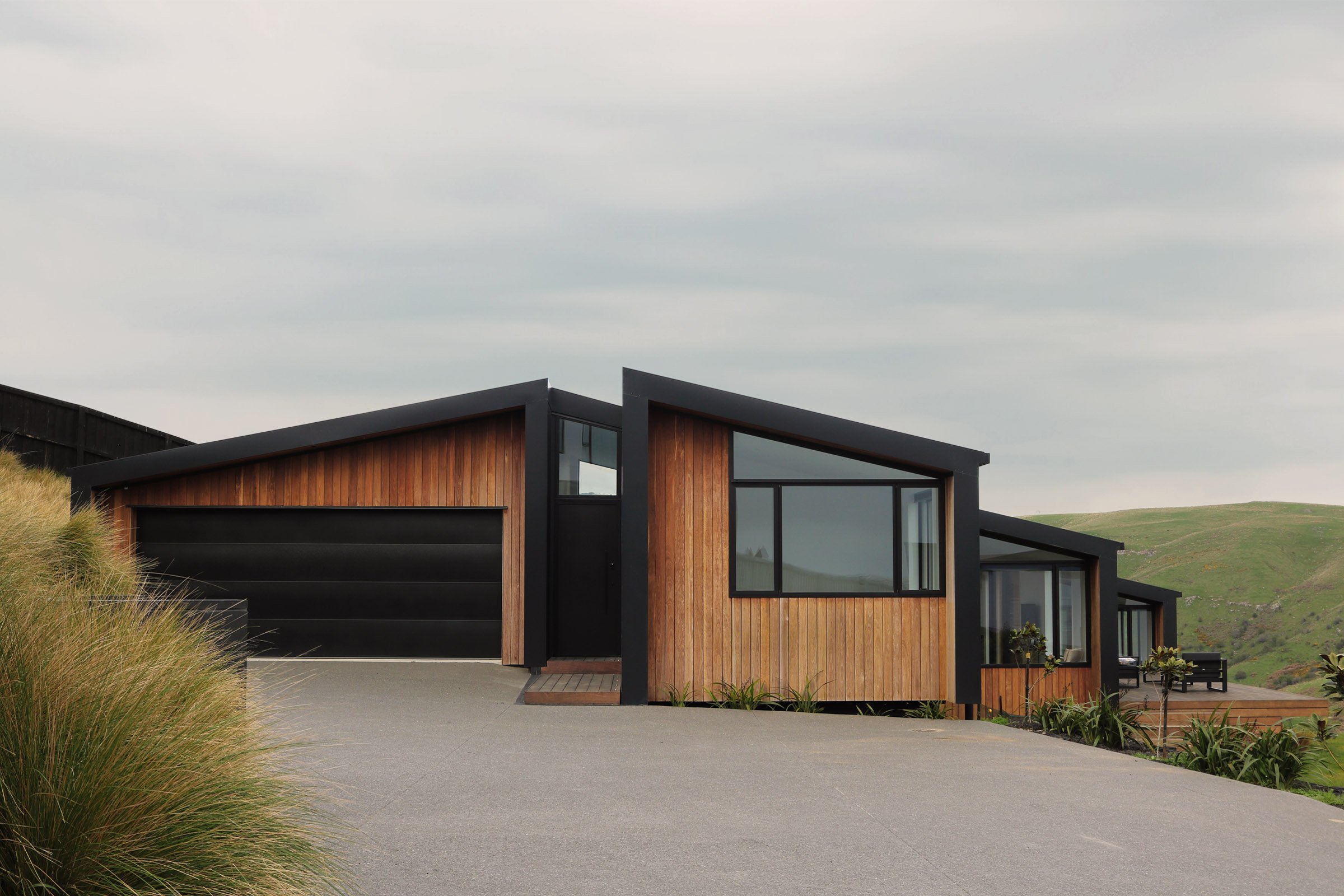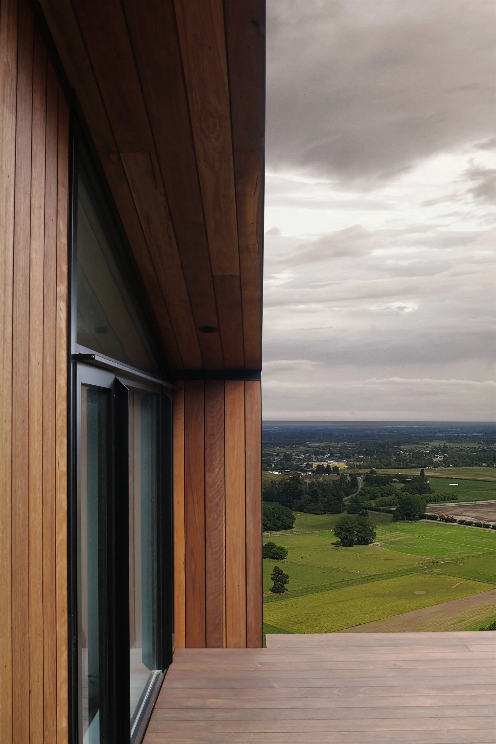 Reclaimed hardwood timber and metal cladding provide durability for a site perched on the edge of an exposed ridgeline in Canterbury’s harsh climate. The cantilevered floor design of the three primary wings lightly touch the site while the garage bunkers into the hill. The staggered form creates protective nooks from prevailing winds, while the roof plane running parallel to the topography ties the spaces together—intending to settle the home into the landscape, rather than contrast it.