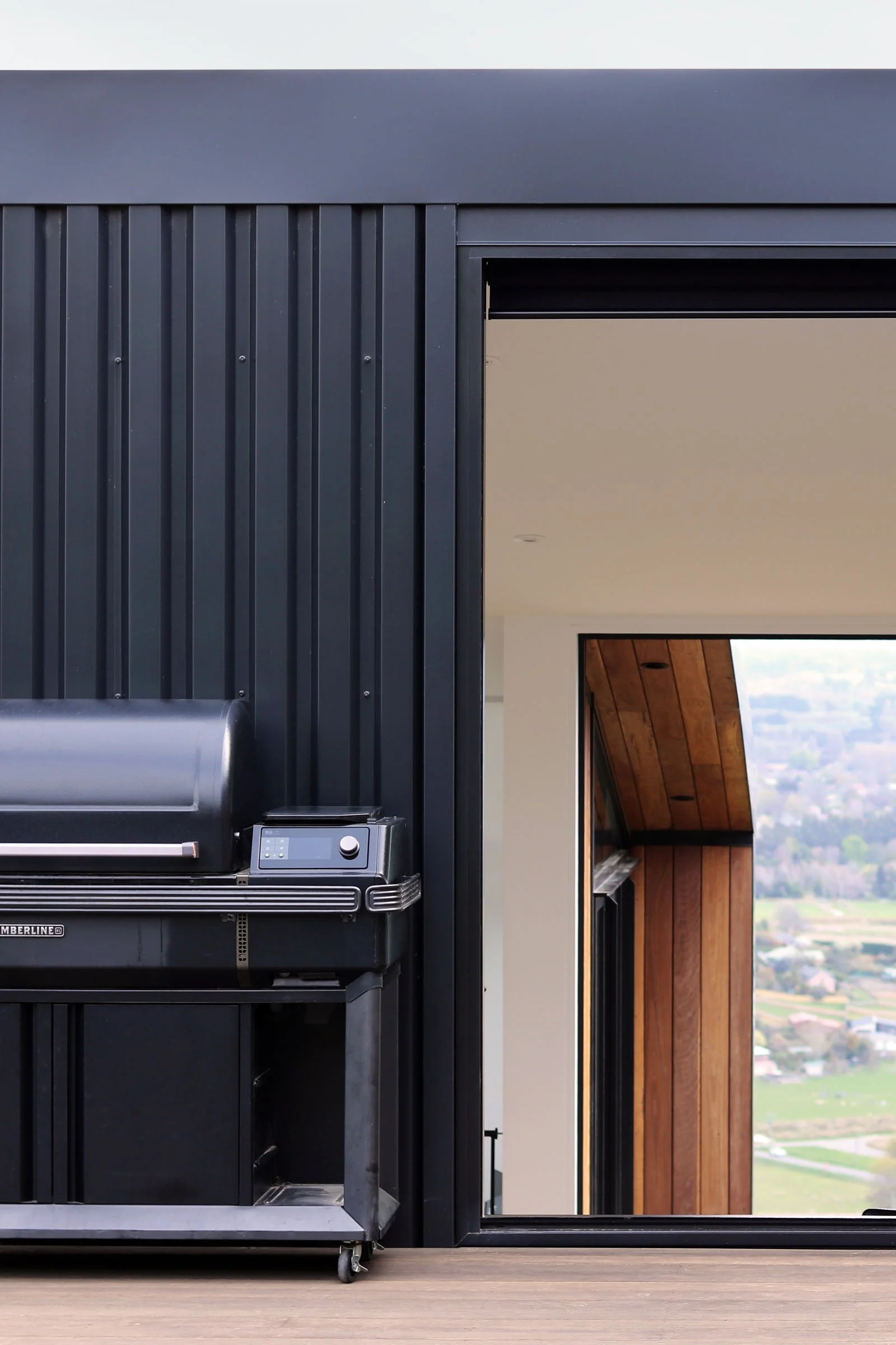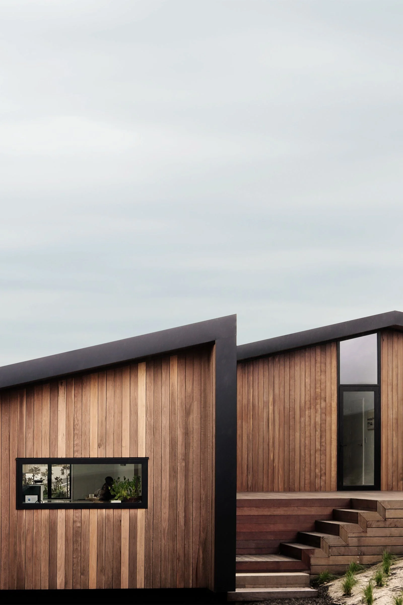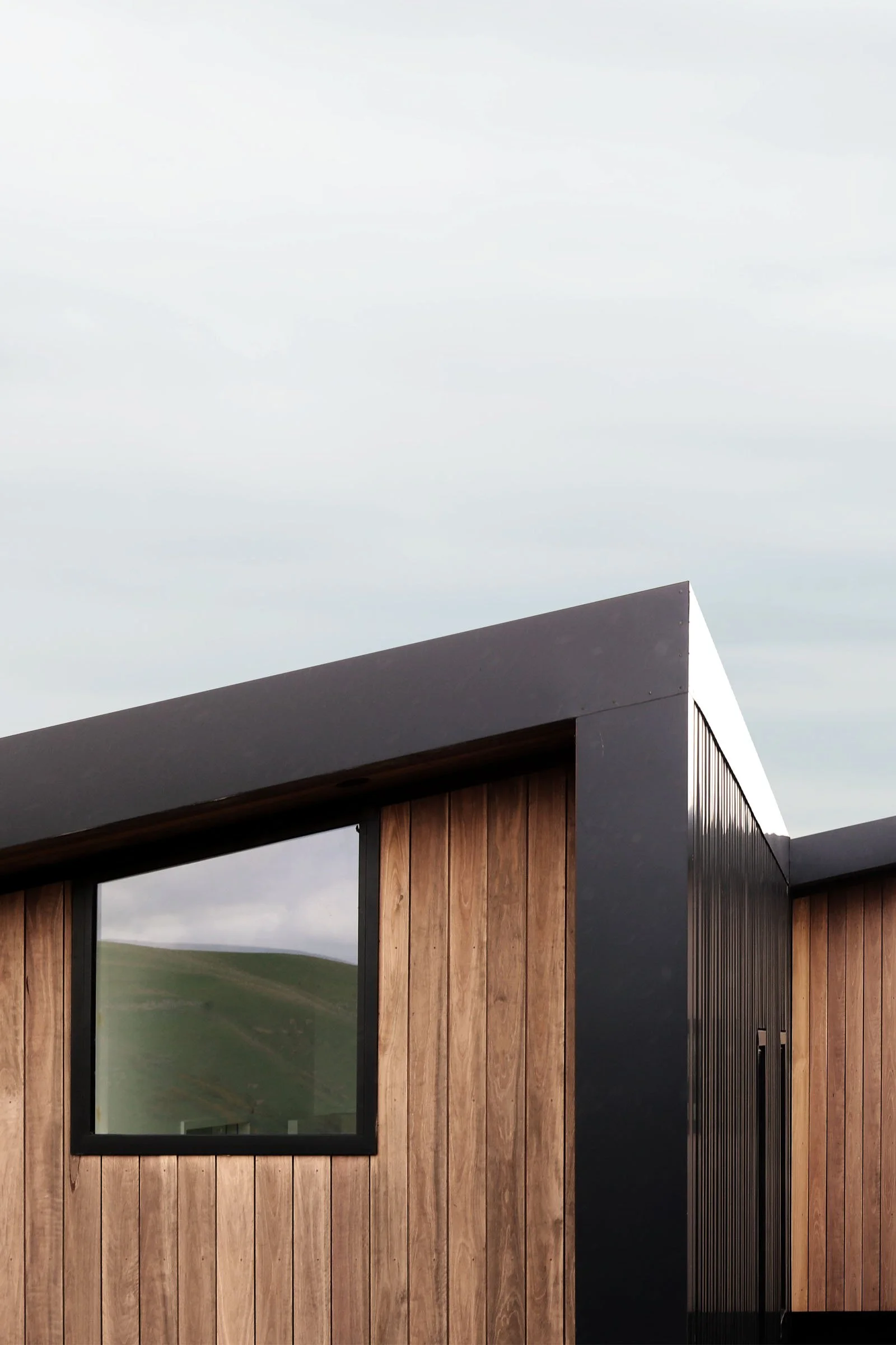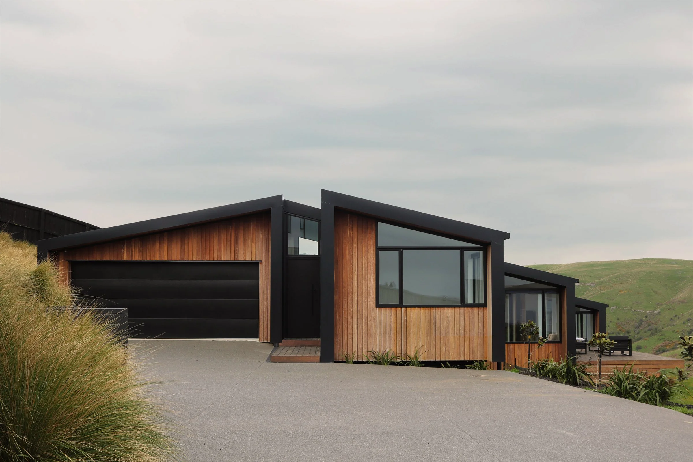 Reclaimed hardwood timber and metal cladding provide durability for a site perched on the edge of an exposed ridgeline in Canterbury’s harsh climate. The cantilevered floor design of the three primary wings lightly touch the site while the garage bunkers into the hill. The staggered form creates protective nooks from prevailing winds, while the roof plane running parallel to the topography ties the spaces together—intending to settle the home into the landscape, rather than contrast it.