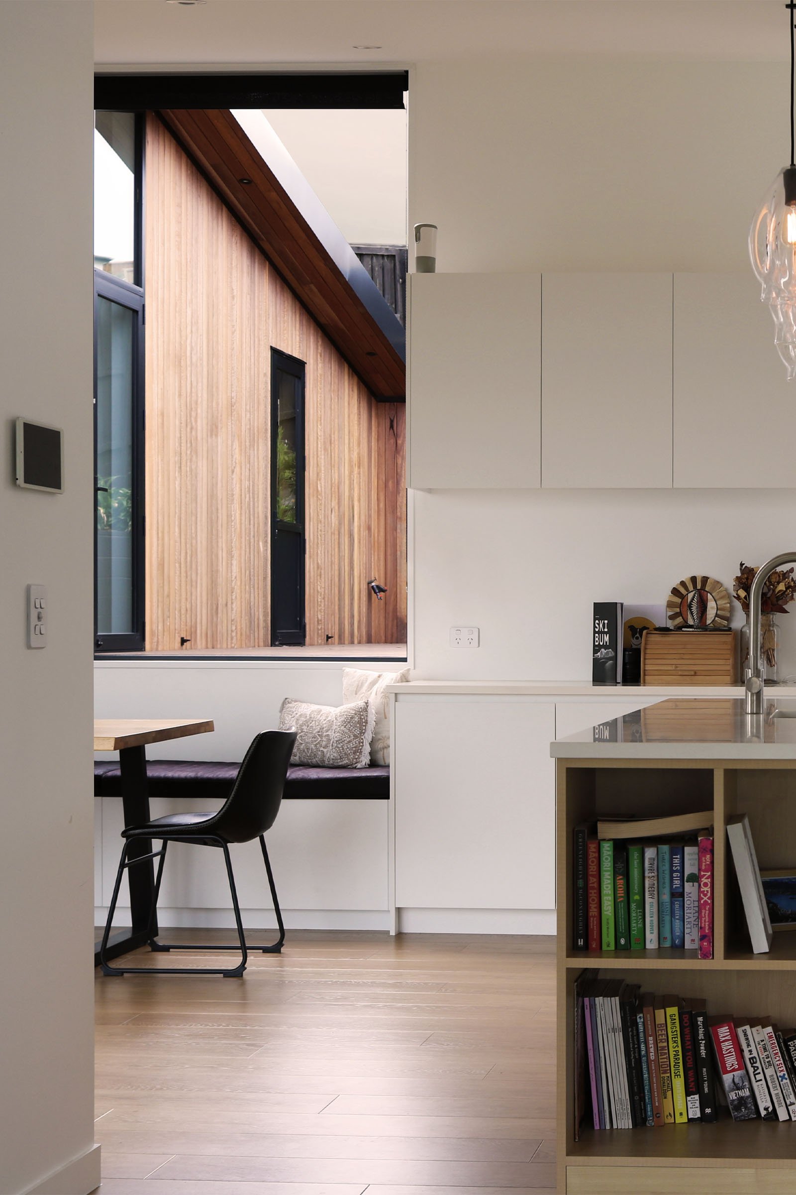 The clients work and play in the mountains, spending much of their time outdoors. The orientation of the home, connection to the landscape and a visual link to the Southern Alps throughout the home was a critical element of their brief from day one. Situated on a sloped site, the home steps down the hill to create three primary wings, ordered through a delineation of public vs. private spaces. The master suite and hybrid space offers privacy in a busy household, often requiring a work-from-home separation. The central wing contains the living activities with direct access to the outdoor areas on each side. When the winds change, the clients can retreat to the back deck, and these “must have” views remain centre stage with floor to ceiling sliding doors framing the horizon. The third wing functions separately for kids or AirBnb guests.